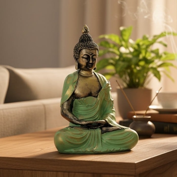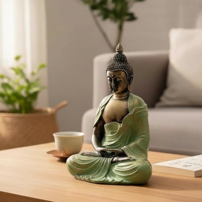 この緑の衣をまとった仏様の仏像は、安らぎと癒しをもたらす特長を備えています!和室や床の間、玄関など、どんな空間にも調和する存在感があり、仏教の心を感じさせるインテリアアイテムとして最適です。