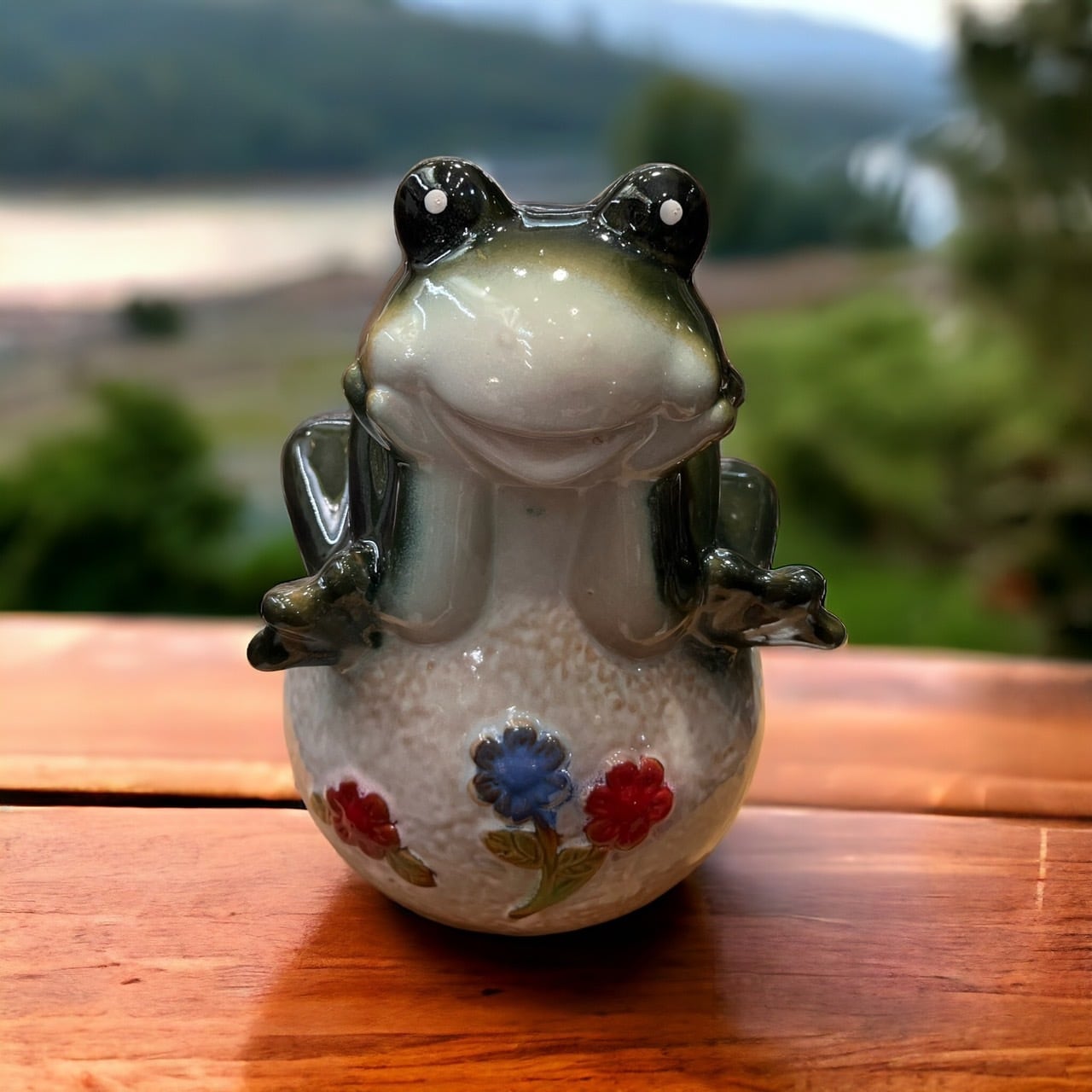 頬杖を付いて笑顔で考え事をするカエルさん。癒し系カエルです。