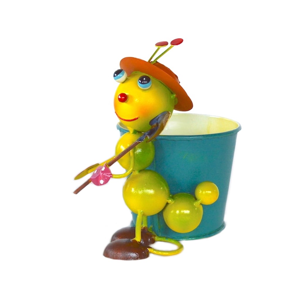 スコップを持ったかわいい青虫さんが付いたブリキのプランター。