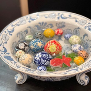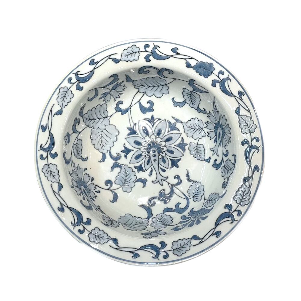 淡いコバルトブルーで草花が描かれた脚付きの水盤。