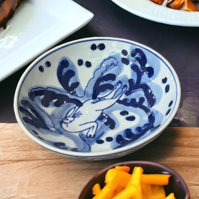 ナマス皿 お皿 丸皿 プレート 波うさぎ 兎 ウサギ 手描き 和食器 染付陶器 シンプル 和風 和柄 おしゃれ ギフト モダン 和 小鉢 醤油皿 惣菜 97601C