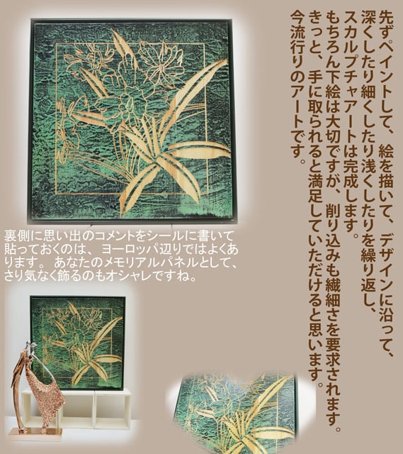 ウッドスカルプチャーアートとも呼ばれており、一枚のパネルに彫刻が施されたおしゃれな壁掛けです。